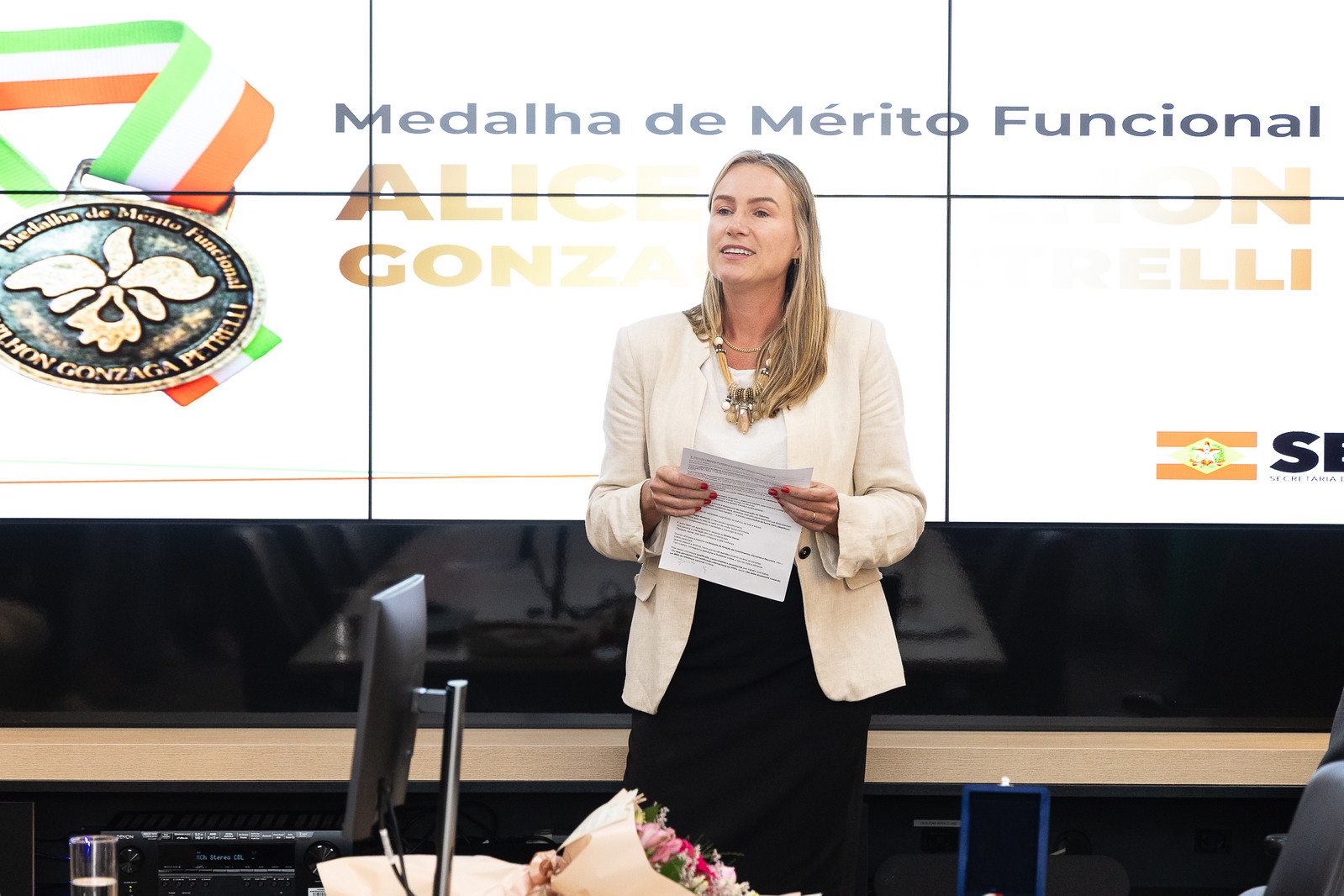 A Medalha de Mérito Funcional Alice Guilhon Gonzaga Petrelli homenageia a primeira mulher admitida na administração pública catarinense e simboliza o reconhecimento a servidores que contribuem de forma exemplar para o aprimoramento da gestão pública e para a melhoria da vida dos catarinenses.
