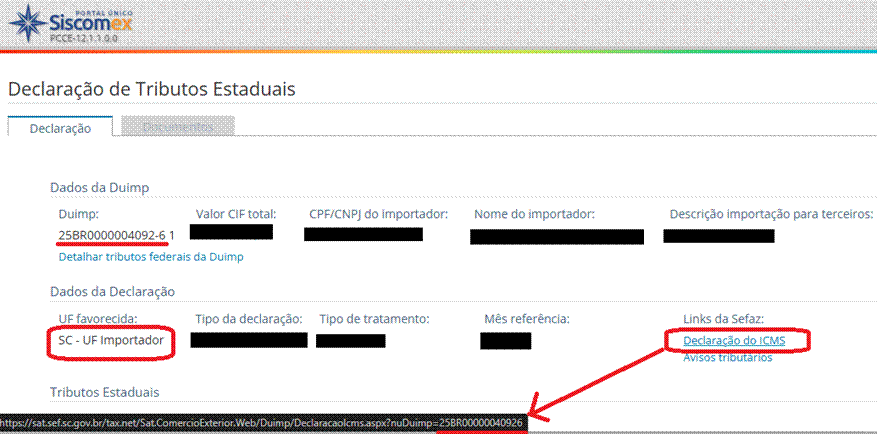 Caso contrário, se Santa Catarina for o sujeito ativo, significa que a SEF/SC entende que o ICMS correspondente a DUIMP deve ser recolhido para o Estado, aguarda a entrega da Declaração do ICMS e também o pagamento do imposto. A declaração inicia com a situação “Aguardando desembaraço aduaneiro” ou “Não declarada” conforme existir ou não o evento do desembaraço. Não será possível elaborar a Declaração do ICMS antes do desembaraço aduaneiro. A entrega da Declaração do ICMS na situação “Não declarada” deve ser feita mesmo que a carga importada já tenha sido entregue por qualquer motivo.