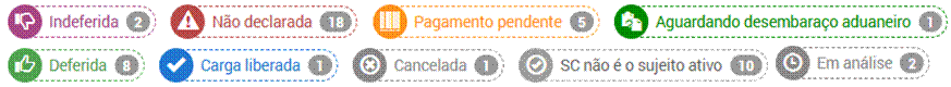 No segundo quadro, logo abaixo do título “Lista de importações”, são mostradas as “pílulas”. Elas representam as situações que as Declarações do ICMS consultadas possuem e exibem a quantidade de declarações naquela situação.