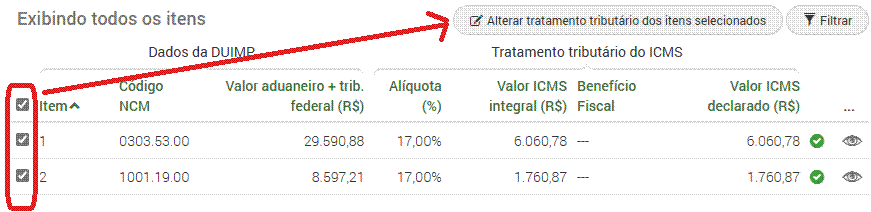 A partir da sugestão inicial do sistema, o usuário pode alterar o tratamento tributário do ICMS de qualquer item. Para tanto, é necessário selecionar um ou mais itens que receberão o mesmo tratamento na caixa à esquerda da tabela. Isso habilita o botão “Alterar o tratamento tributário dos itens selecionados”.