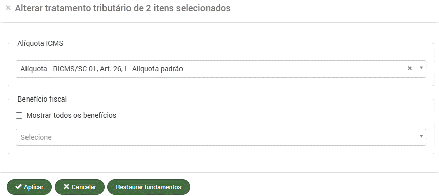 Na janela do tratamento tributário para os itens selecionados, há dois campos: o primeiro, de preenchimento obrigatório, serve para selecionar o fundamento legal que define a alíquota do ICMS para o recolhimento integral do imposto; o segundo, opcional, permite selecionar um fundamento legal que corresponda a um benefício fiscal.
