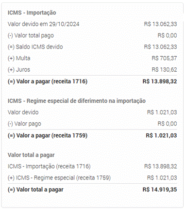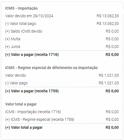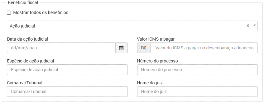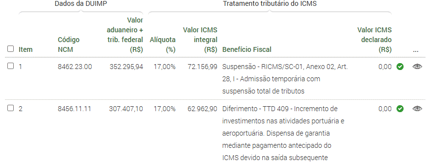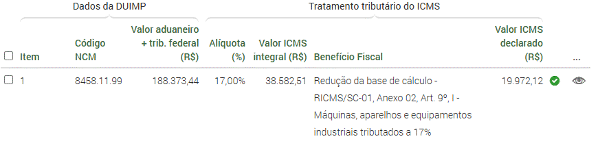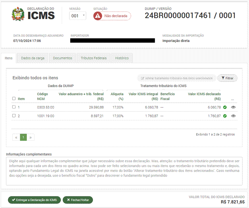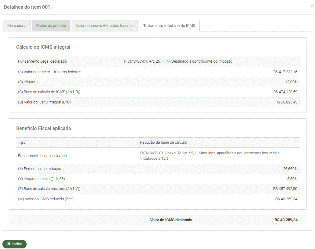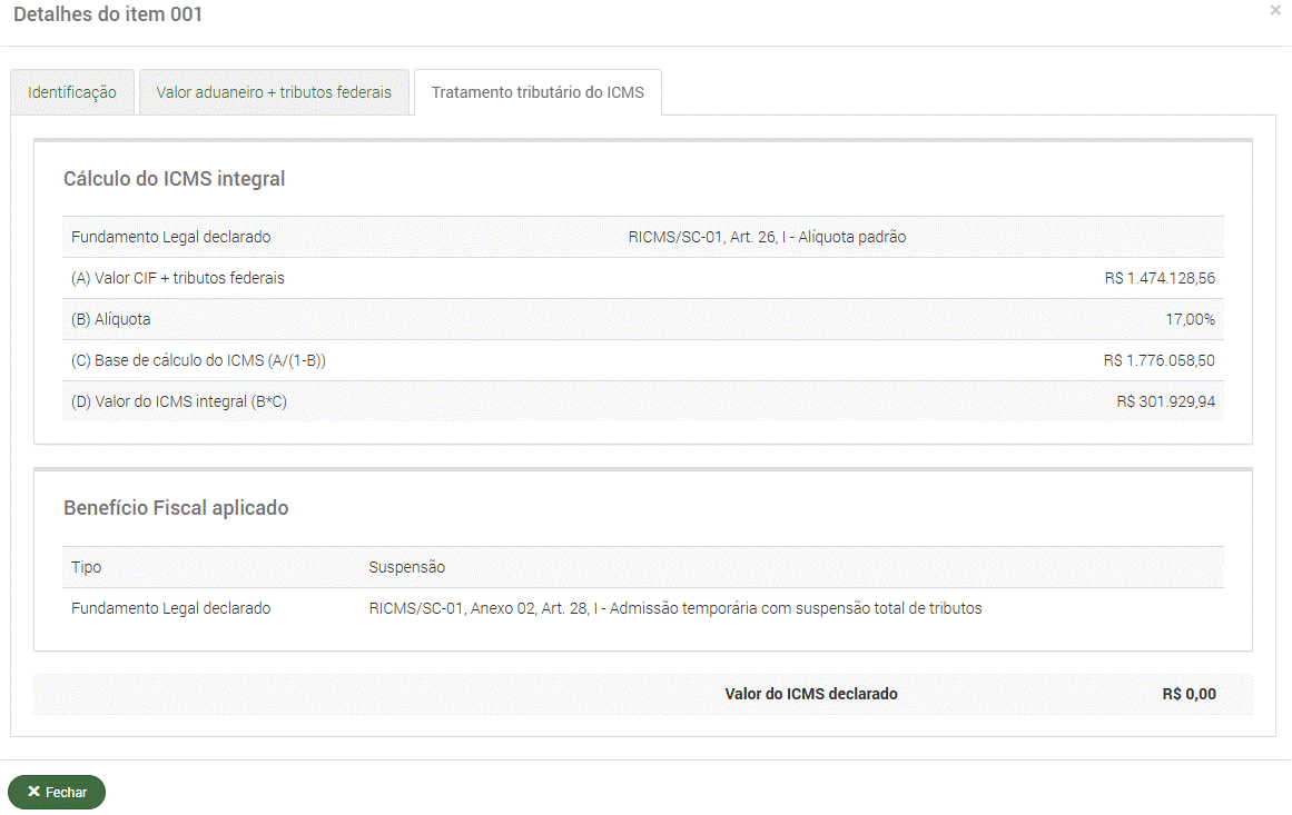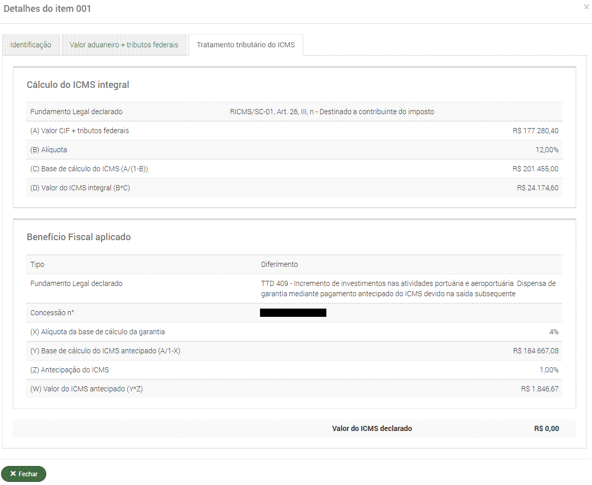 O benefício fiscal aplicado pode, em muitos casos, reduzir ou exonerar o valor do ICMS. Então, a última linha “Valor do ICMS declarado” apresenta o valor do ICMS devido no momento do desembaraço aduaneiro.