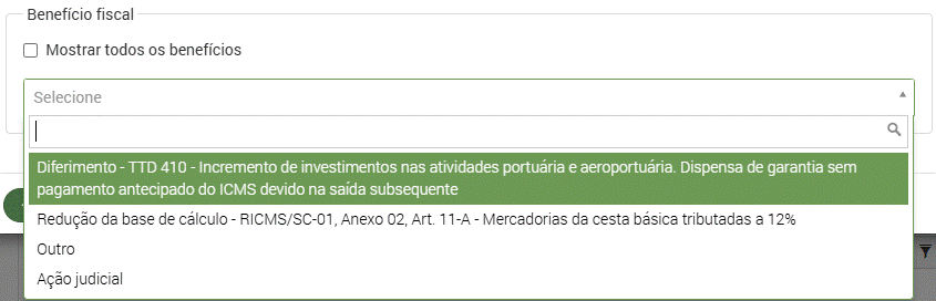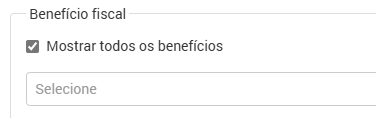 No campo onde se seleciona o benefício fiscal, existe a possibilidade de fazer com que o sistema apresente todos os fundamentos legais cadastrados no sistema, mesmo que incompatíveis com os itens selecionados. Basta marcar o campo “Mostrar todos os benefícios” e qualquer fundamento legal poderá ser selecionado.