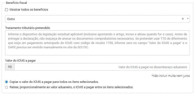 A opção “Outro” sempre estará disponível para o caso do sistema não oferecer o fundamento legal do ICMS que o importador julga ser correto. Se optar por “Outro” preencha obrigatoriamente os campos que surgirão. Neste caso, o valor do ICMS a pagar é aquele devido na data do desembaraço aduaneiro, sem multa nem juros.