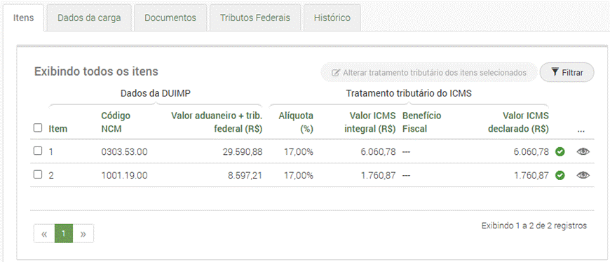 Na aba “Itens” é onde o tratamento tributário do ICMS é realizado. A declaração é feita por item da DUIMP e o sistema, inicialmente, apresenta todos eles com o ICMS integral pré-calculado e sem benefício fiscal atribuído.