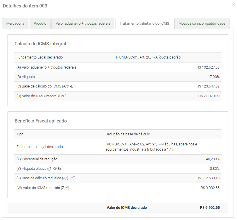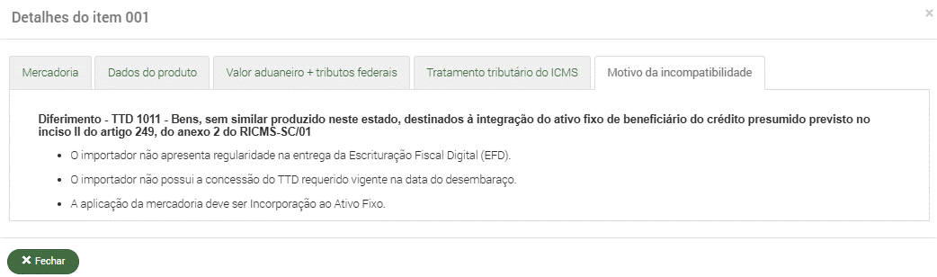 IMPORTANTE: Para utilizar um fundamento legal que o sistema identificou como incompatível, resolva primeiro o motivo da incompatibilidade. Dependendo do motivo, será necessário promover uma retificação da DUIMP, quitar débitos que impedem a emissão da Certidão Negativa de Débitos, entregar os arquivos de Escrituração Fiscal Digital ainda não enviados para a SEF/SC, atualizar o cadastro do estabelecimento importador na SEF/SC ou qualquer outra condição apresentada pelo sistema como impeditiva para uso do fundamento legal.