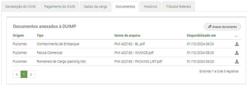 Na aba “Documentos” são listados todos os documentos anexados à DUIMP que a SEF/SC teve acesso. Novos documentos poderão ser anexados nesta aba. Estes ficarão disponíveis apenas no SLEI e poderão ser excluídos até que ocorra o deferimento da Declaração do ICMS.