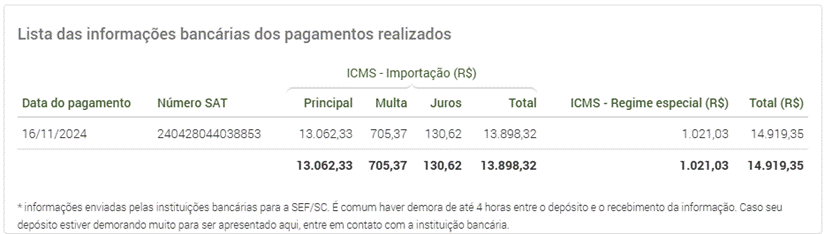 As informações bancárias dos pagamentos realizados é um serviço prestado pela rede bancária e é comum haver um tempo de espera de até 4 horas entre o pagamento até a chegada da informação na SEF/SC. Não são raras as ocasiões em que os bancos retém a informação dos pagamentos até a madrugada seguinte por problemas técnicos ou para auditoria e averiguação de fraudes. Por favor, em caso de demora excessiva para a informação do seu pagamento chegar até a SEF/SC, entre em contato com a sua instituição bancária.