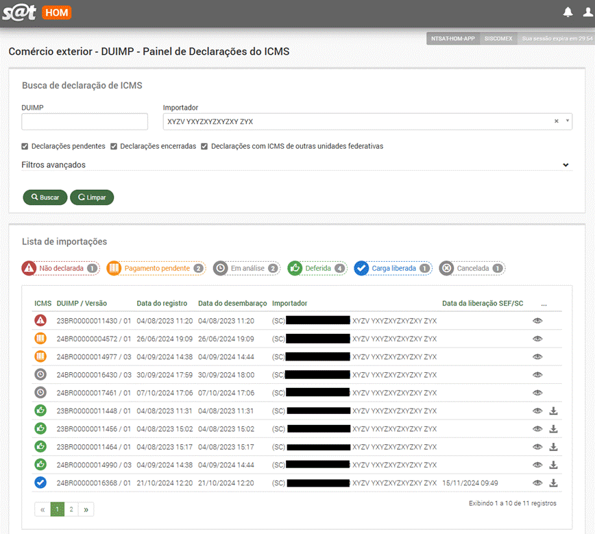 O usuário pode consultar todas as DUIMPs de qualquer importador representado por ele. Por padrão, a tela abre com a lista de todas as DUIMPs que apresentam alguma pendência em relação ao ICMS.