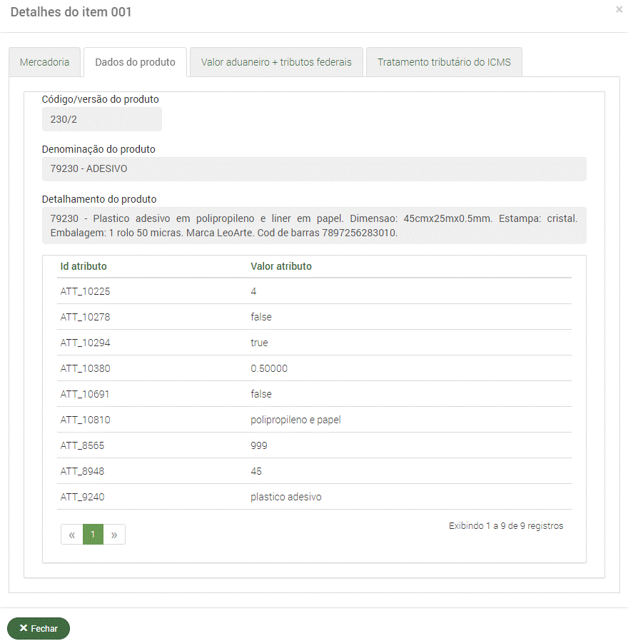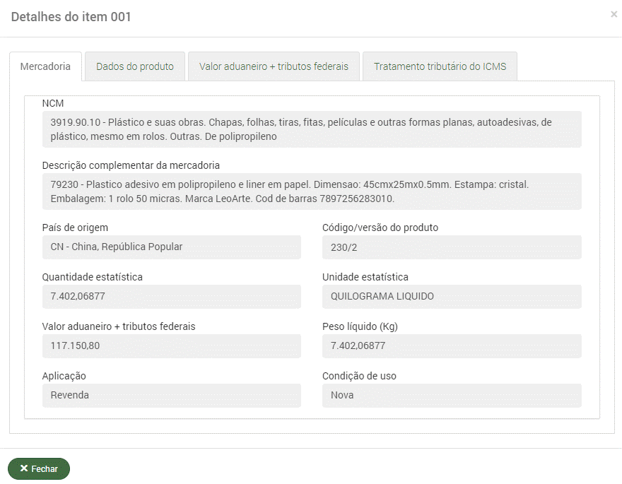 Em “Mercadoria” são apresentadas características do item. Todas as informações são provenientes da DUIMP.