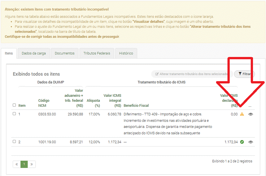 O sistema vai apontar os itens que receberam fundamento legal incompatível. Eles apresentarão um ícone de alerta na cor laranja e será necessário refazer o tratamento tributário do ICMS deles. Uma mensagem de atenção também será apresentada como na figura abaixo.