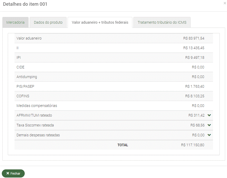 Todos estes valores têm origem na DUIMP registrada no Portal Único Siscomex. O SLEI utiliza para compor a base de cálculo do ICMS do item o valor aduaneiro somado com os valores a recolher dos tributos federais. O valor do AFRMM/TUM é rateado entre os itens proporcionalmente aos seus pesos líquidos. A Taxa Siscomex e as demais despesas aduaneiras são rateadas entre os itens proporcionalmente aos seus valores CIF.