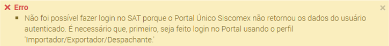 Para esta forma de acesso funcionar é necessário que o usuário já esteja autenticado (feito login) no Pucomex em outra aba do mesmo navegador web. Caso o usuário ainda não esteja logado no Pucomex, a mensagem abaixo é exibida e o sistema abre nova aba do navegador web apontando para o endereço inicial do Pucomex: https://portalunico.siscomex.gov.br/portal/.