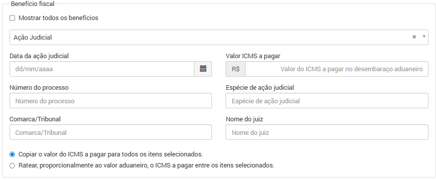 Da mesma forma que existe na opção “Outro”, se mais de um item estiver selecionado, na opção “Ação judicial” também haverá a opção de copiar ou ratear o valor do ICMS a pagar declarado.