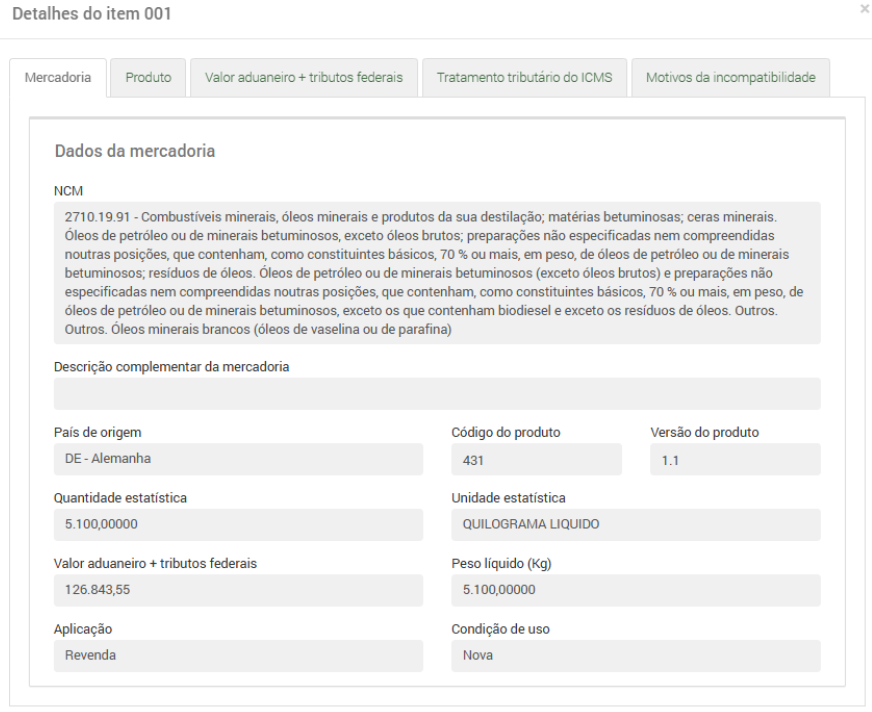 Em “Mercadoria” são apresentadas características do item importado. Todas as informações são provenientes da DUIMP.