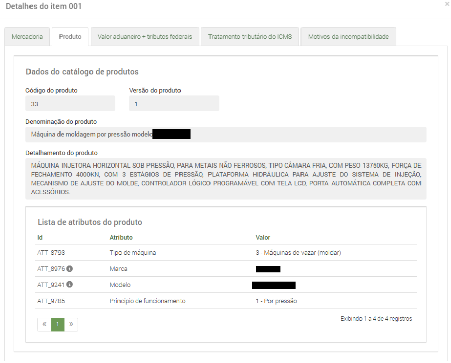 Em “Produto” são apresentadas as características do produto que foi associado ao item importado. Todas as informações são provenientes do Catálogo de Produtos mantido pelo importador no Portal Único Siscomex.
