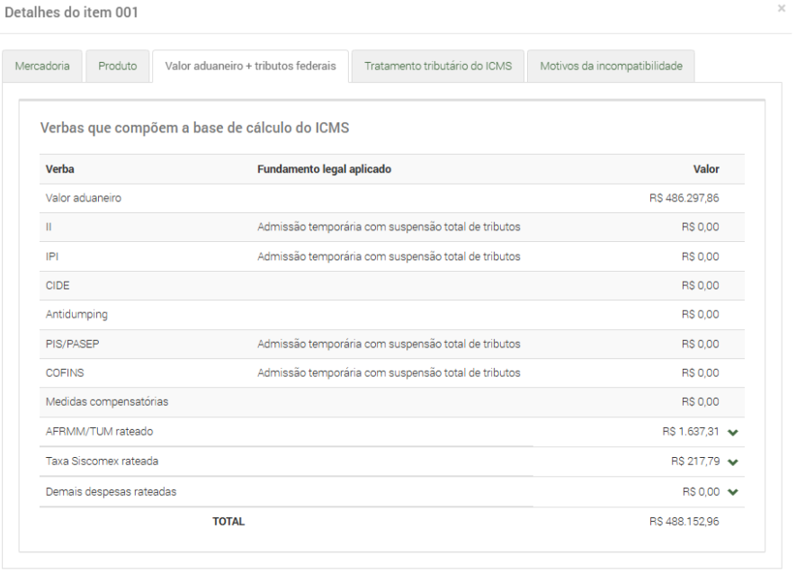 “Valor aduaneiro + tributos federais” mostra a formação do valor que irá compor a base de cálculo do ICMS do item.
