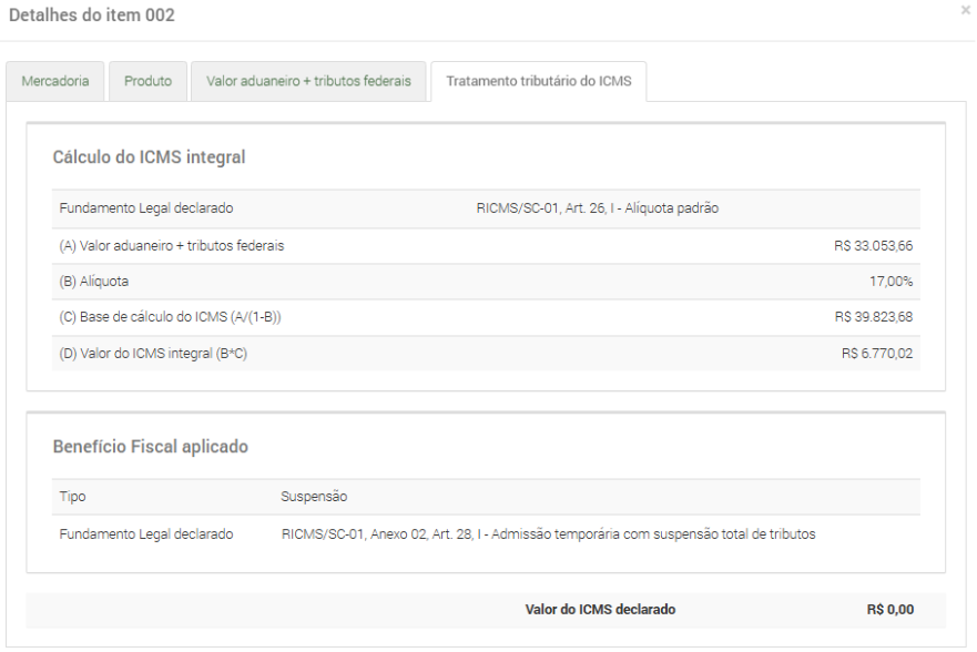 Desta forma, a Declaração do ICMS de uma DUIMP pode iniciar com uma das duas situações: “Não declarada” ou “Santa Catarina não é o sujeito ativo da obrigação tributária”.